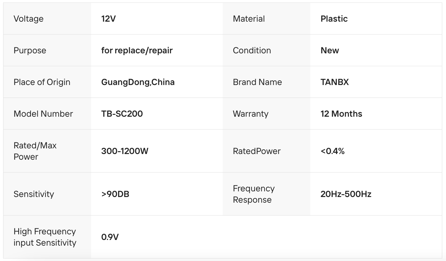 TANBX TB-SC200 is an innovative 8-inch under-seat subwoofer with a durable plastic enclosure, delivering 300–1200W power and a wide 20Hz–500Hz frequency range. It offers deep, responsive bass in a compact, space-saving design, with a built-in amplifier for easy installation—perfect for upgrading your car audio system.