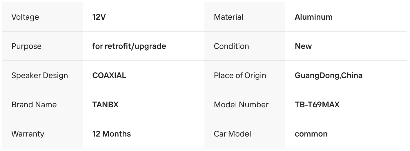 TANBX TB-T69MAX 6×9" Aluminum Coaxial Car Speakers Built with a durable aluminum cone, delivering clear highs and strong bass. Easy 12V installation, perfect for upgrading your car audio system.