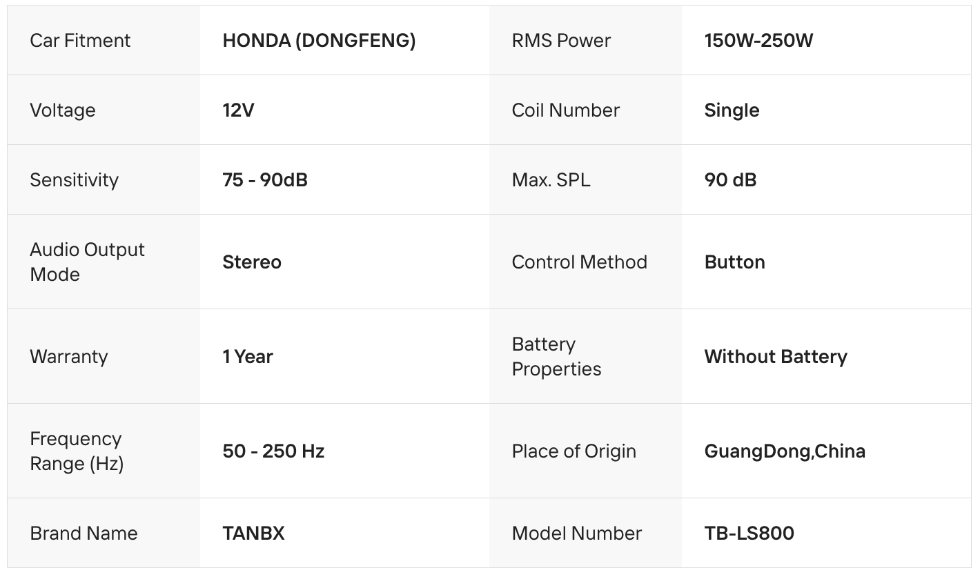The TB-LS800 is an 8-inch active subwoofer with built-in amplifier, designed for compact car audio setups. Featuring a 4-ohm configuration and trapezoid enclosure, it delivers strong, tight bass while fitting easily into limited spaces.