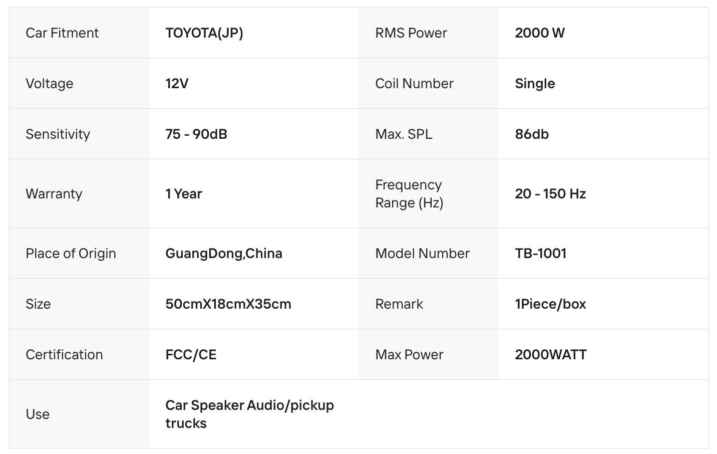 The TB-1001 is a 10-inch ultra-slim active subwoofer designed for pickup trucks and space-limited vehicles. With a built-in amplifier, it offers easy installation and delivers deep, punchy bass without taking up much space.