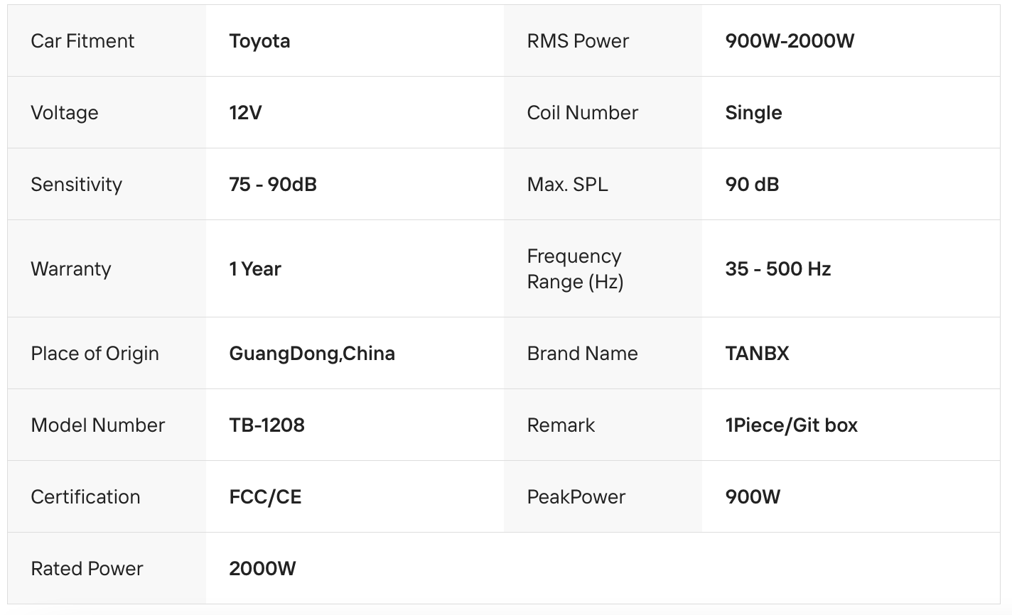 TANBX TB-1208 is an 8-inch active car subwoofer delivering powerful 2000W bass output. Designed for compact installation, it features a built-in amplifier and durable enclosure for enhanced low-frequency performance. Ideal for upgrading your car audio system with deep, punchy bass and easy plug-and-play setup.