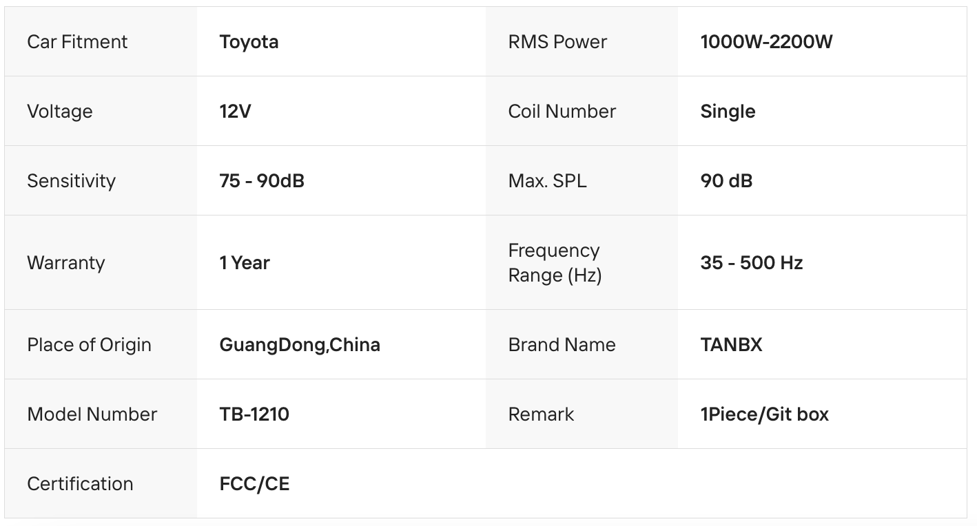 TANBX TB-1210 is a high-power 10-inch semicylinder car subwoofer with 2200W output, delivering deep and impactful bass. Its unique enclosure design enhances sound performance while saving space, and the built-in amplifier ensures easy installation. A solid choice for drivers who want stronger, richer low-frequency audio in their car.
