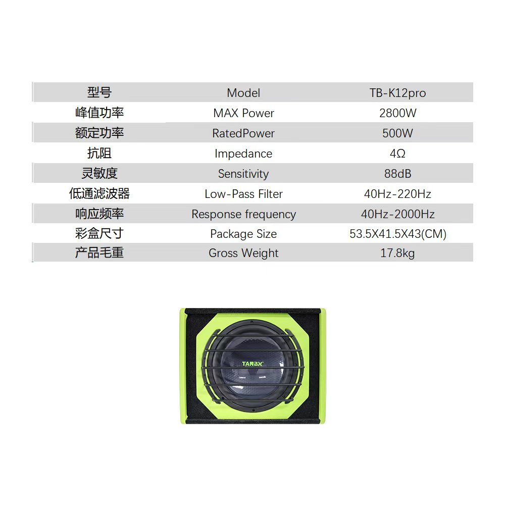 The TB-K12PRO is a high-power 12-inch active car subwoofer designed with a trapezoid enclosure for enhanced bass output and efficient space utilization. Featuring a built-in amplifier, it delivers deep, punchy bass with strong performance and stability. Engineered for OEM and wholesale applications, it is ideal for users seeking powerful and reliable car audio upgrades.